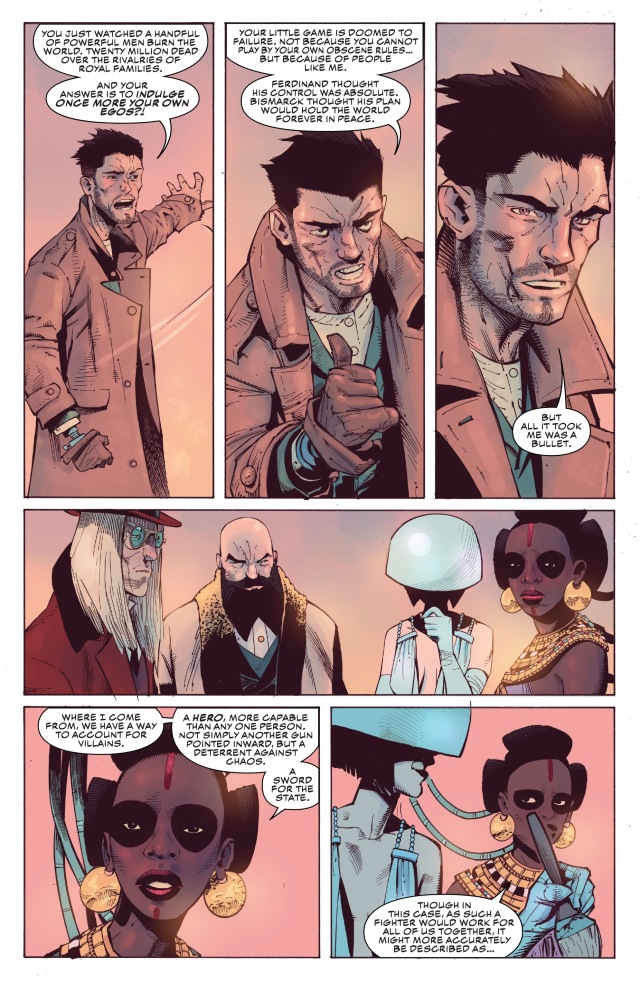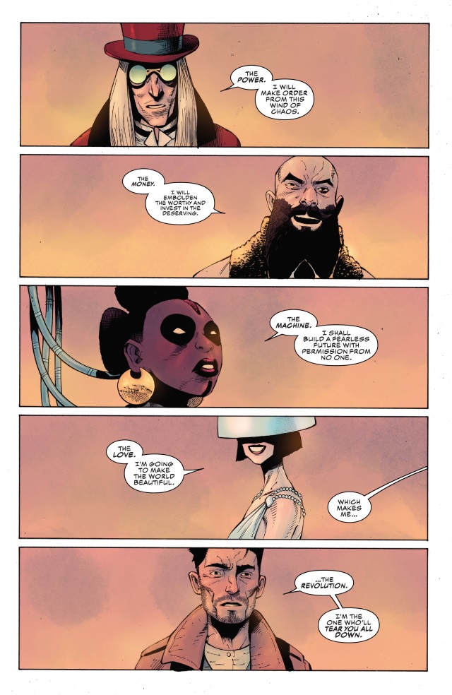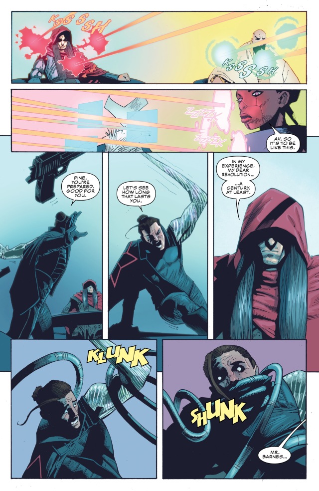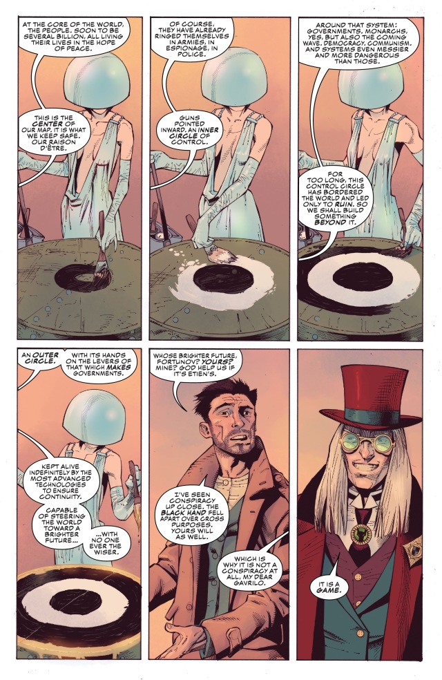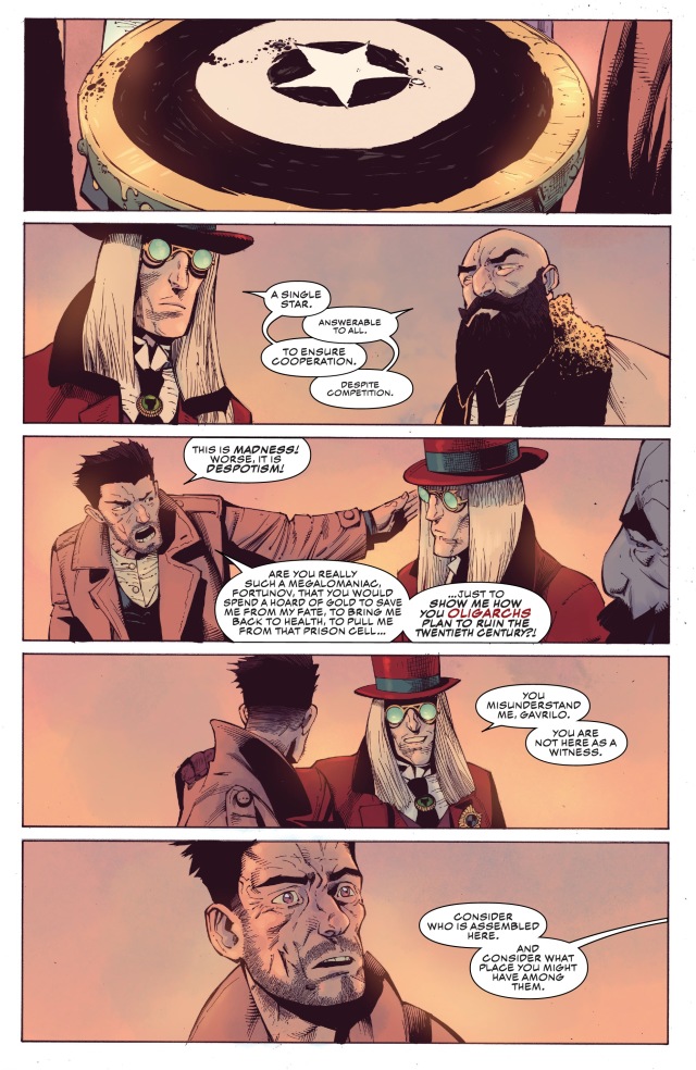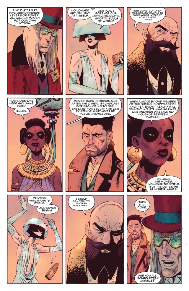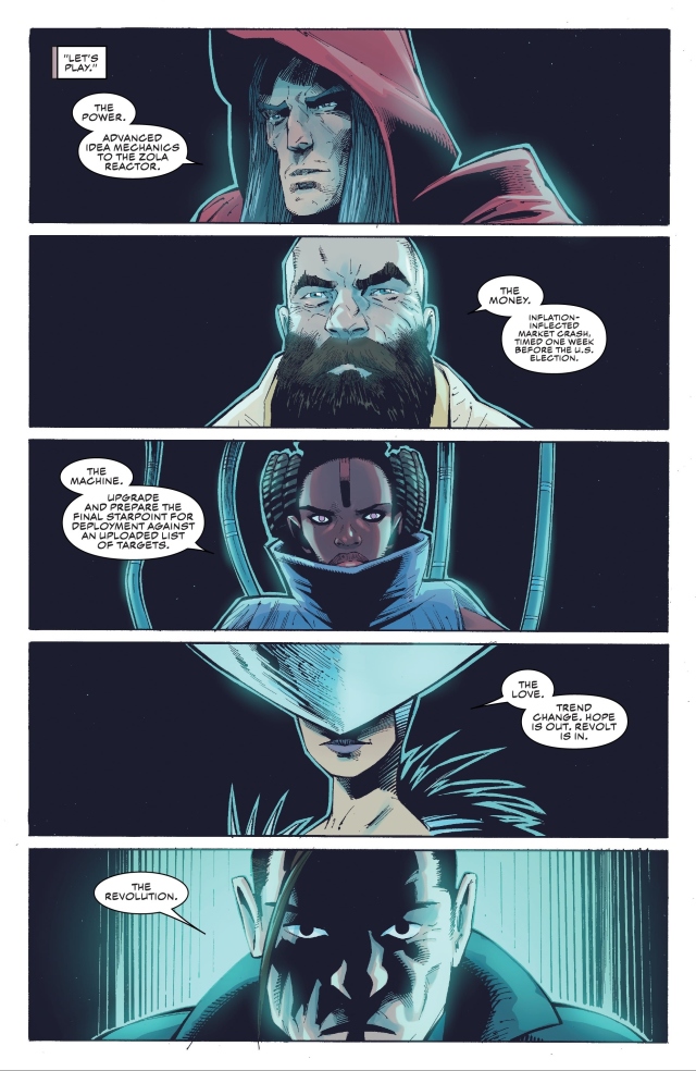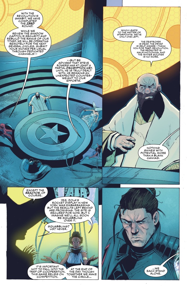 而在外環上,第24輪遊戲開始了——「權力」要把「超智機構」(A.I.M.)派去在前陣子的《美國隊長》#0中出現的索拉(Zola)反應爐、「金錢」要安排股市在美國大選前一周因為通貨膨脹而崩盤、「機械」要安排僅存的最後一位星之頂點得到足夠的升級,好刺殺所有指定的目標、「愛」打算改變世界潮流,將希望改為暴動......