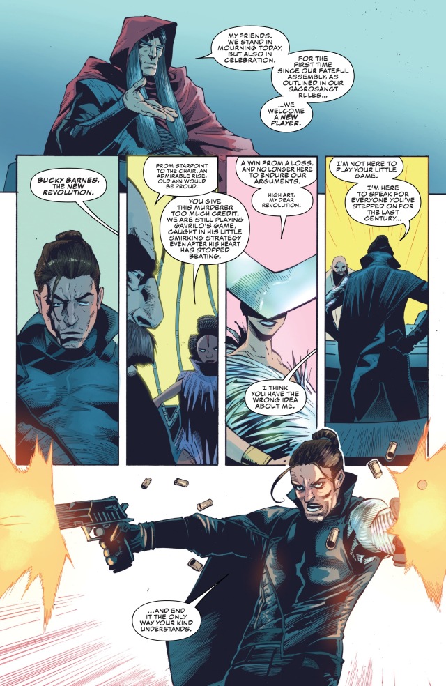 時間來到現在。不久之前,「革命」加夫里洛·普林西普在向「酷寒戰士(Winter Soldier)」巴奇‧巴恩斯坦承了自己操控他人生的行為之後,在史蒂夫的面前遭到下定決心的巴奇槍殺,於是他就此成為了新的「革命」。
