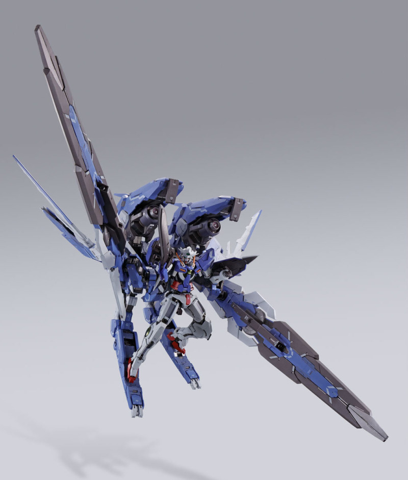 此次在 METAL BUILD 的商品化企畫邀請到機械設計師海老川兼武重新設計了 GN ARMS TYPE-E 的外觀造型與新機構,融入 GN ARMS 的前身也就是祕天使鋼彈的典籍戰機多項特徵,大幅提升外裝甲的細節密度,機翼與大型 GN 劍也更加大型化、銳利化,並能分離出彷彿典籍戰機的「支援形態」與「GN典籍組件」,重新設計出 METAL BUILD 獨有的新規格。