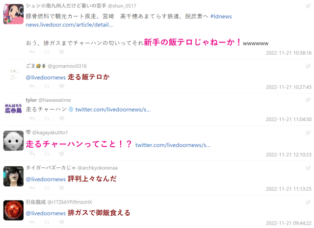 由於排出的廢氣被比喻為有炒飯的味道,不少網友也揶揄表示 : 「這根本是會走路的便當吧www」。