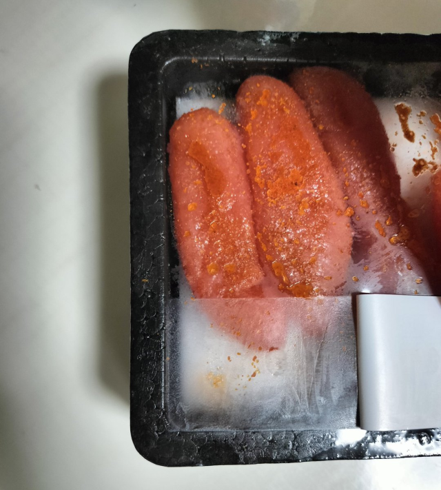 看看這盒「辣味明太子」,原本盒裝看起來沒有什麼奇怪的地方,拆開盒裝後卻發現外面貼的紙條包裝下,底下的明太子居然偷偷的...長短不一,讓推主自己也感到哭笑不得。