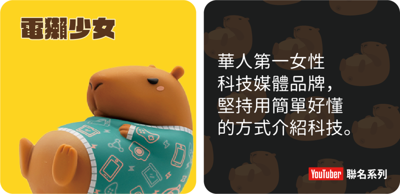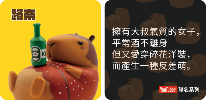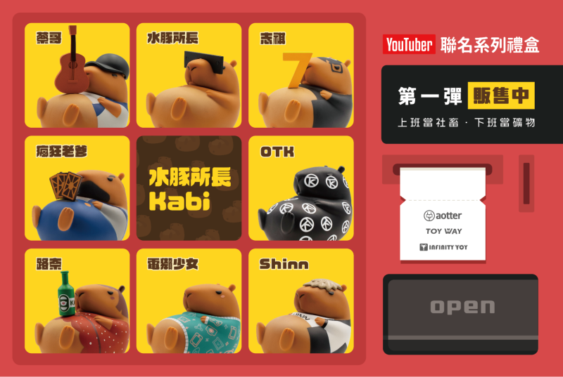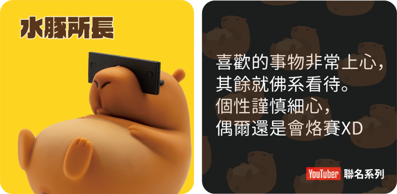 「水豚所長 Kabi 」為電獺發行之全新 IP,可愛療癒又厭世的模樣,讓水豚所長甫出世便廣受好評,成為超人氣吉祥物,粉絲紛紛敲碗能看到不同造型的水豚所長,電獺進而與多位知名 YouTuber 網紅聯名,推出全球限量實體水豚公仔,讓收藏家們為之瘋狂!