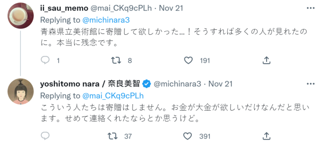 雖然有網友表示應該可以寄贈給當地的美術館 ( 青森縣 ),不過奈良美智認為如果是因為需要錢才要拿去拍賣,至少也可以知會他一聲,他也不是如此吝嗇的人。