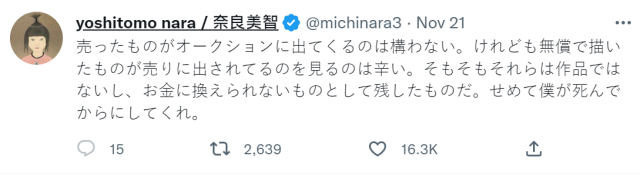 當然對於奈良美智這樣大名鼎鼎的創作者來說,這種無償的繪圖卻被轉售出去獲利還是感到十分沮喪。雖然也沒有明定說不能轉售出去,但是本於善意的行為還是希望不要有這樣情況發生,就算真的是因為經濟困難,也希望可以告知他再拿去出賣。