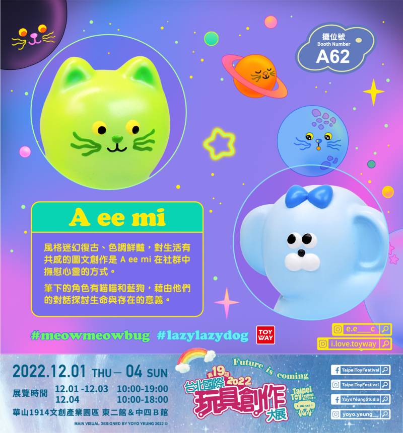 這兩隻有點怪,卻怪得相當可愛的療(謎)癒(樣)生物,來自台灣圖文創作者「A ee mi」的作品。 霓虹般的絢麗色調、迷幻又復古,超現實的風格讓人印象深刻,尤其充滿共感、發人省思的文字,更為喵喵藍狗注入靈魂,帶入感極強的插畫故事真摯動人,席捲社群平台,總能被喵喵與藍狗的對話觸動心靈,撫慰憂傷,就像喝下一碗碗讓心熱熱的雞湯~