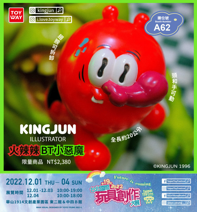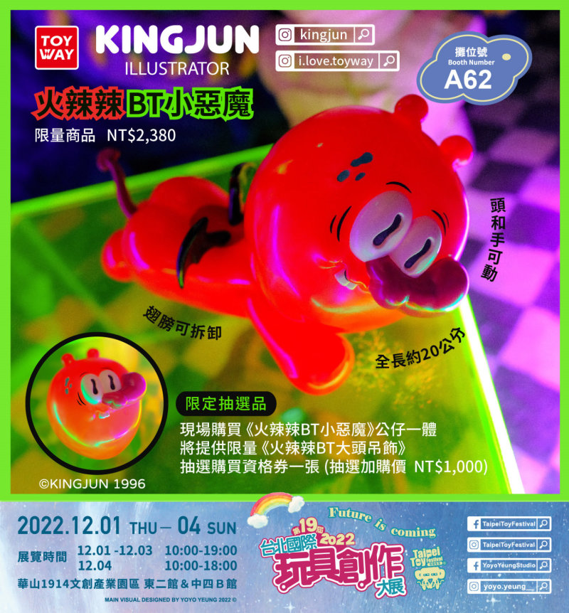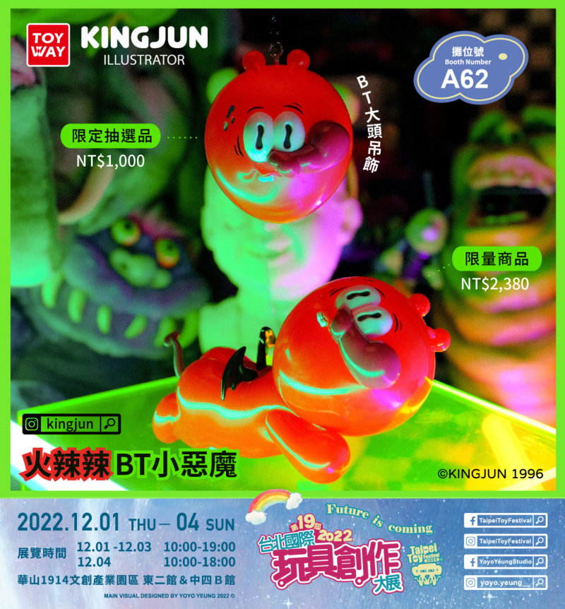 ・多變不受限!最好玩的超人氣圖像創作者KINGJUN,同名插畫品牌「KINGJUN」創立於2014年,以復古美式元素融入獨特世界觀,添加快樂與瘋狂,打造專屬的螢光繽紛宇宙世界,邀請大家拋開煩惱,一起探索KINGJUN王國!