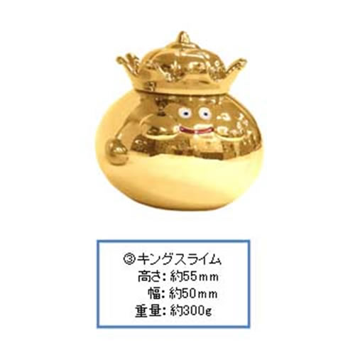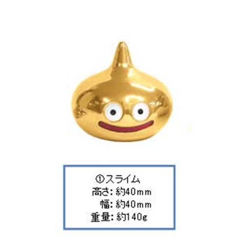 Square推出的經典電玩遊戲勇者鬥惡龍即將邁入25個年頭,為了慶祝25周年紀念發行了一系列的紀念商品,之前發售過第一彈ドラゴンクエストⅠ~Ⅲの主人公,現在11月預計推出史萊姆紀念商品第二彈,將史萊姆家族的三位成員,史萊姆、融化史萊姆、大王史萊姆等等都以金屬材質配合黃金色的電鍍塗裝,史萊姆約4公分高,融化史萊姆約2公分高,大王史萊姆約5.5公分高,販售價格史萊姆1,890元日幣、融化史萊姆1,890元日幣、大王史萊姆2,289元日幣。
