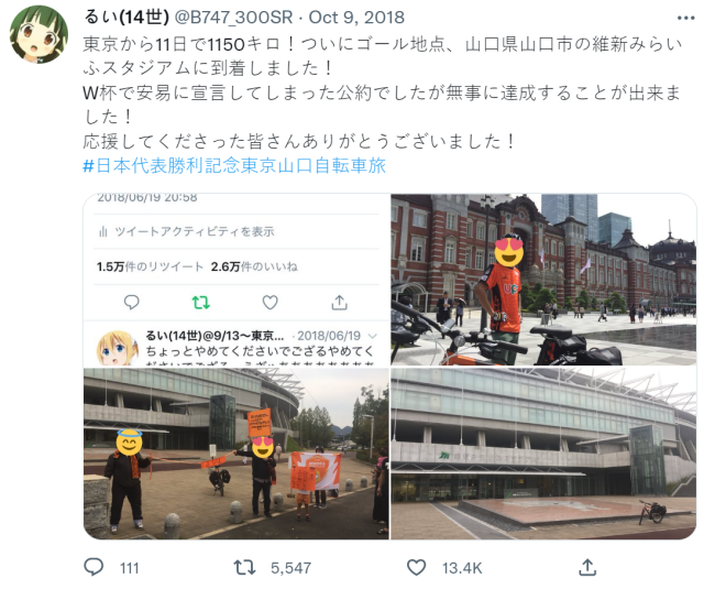 這幾天日本人最開心的事情,莫過於世界盃足球賽逆轉贏過德國的喜悅,幾乎讓不少日本人感覺彷彿像夢一般的存在。而在推特上也出現不少祭品文,其中一位網友-るい ( @B747_300SR ) 在當天發推文表示 : 「贏德國就騎腳踏車近千公里回家。」,而這趟旅程是從日本山口縣到東京,距離可是超過 1000 公里的路程,現在夢想成真,大批網友湧入祝賀,期待他的成果。