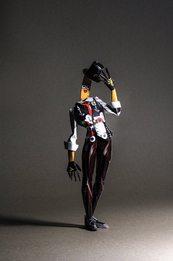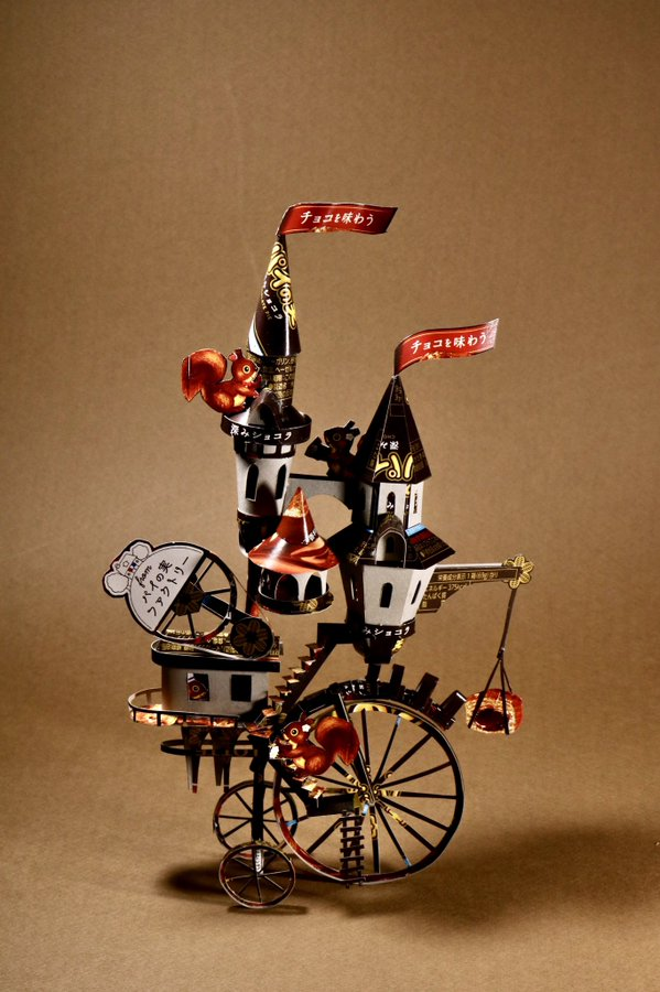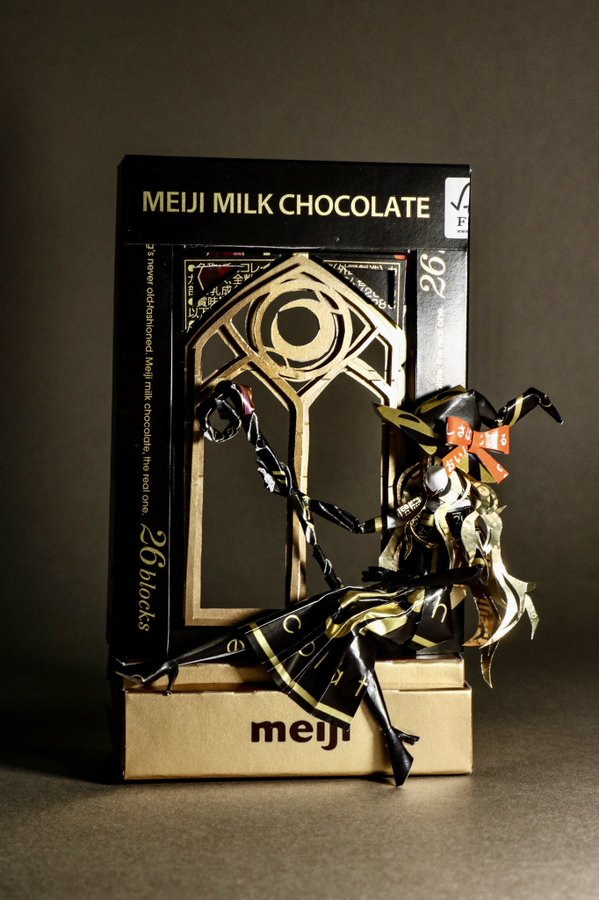 最近他也公布最新作品,是將日本人氣零食-Toppo巧克力棒,將起製作成像是紳士般的模樣,沒想到一個看似平凡無奇的盒裝,居然可以成為一個人型造型外,還可以如此帥氣 XD,更獲得超過 20 萬以上的讚數。