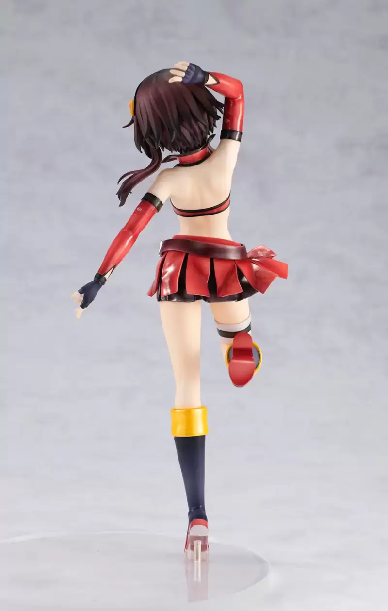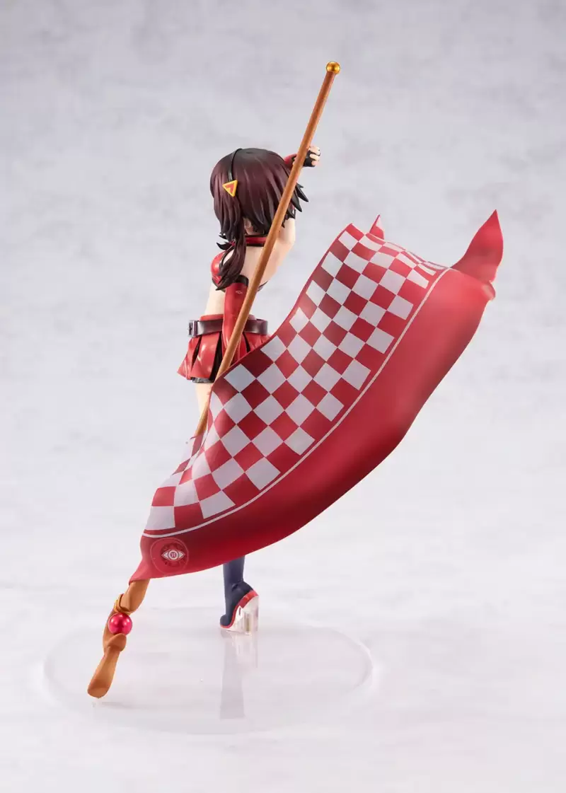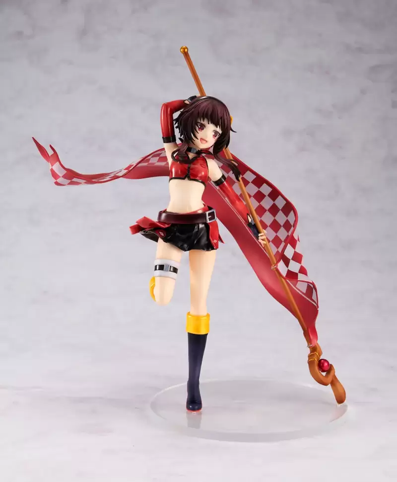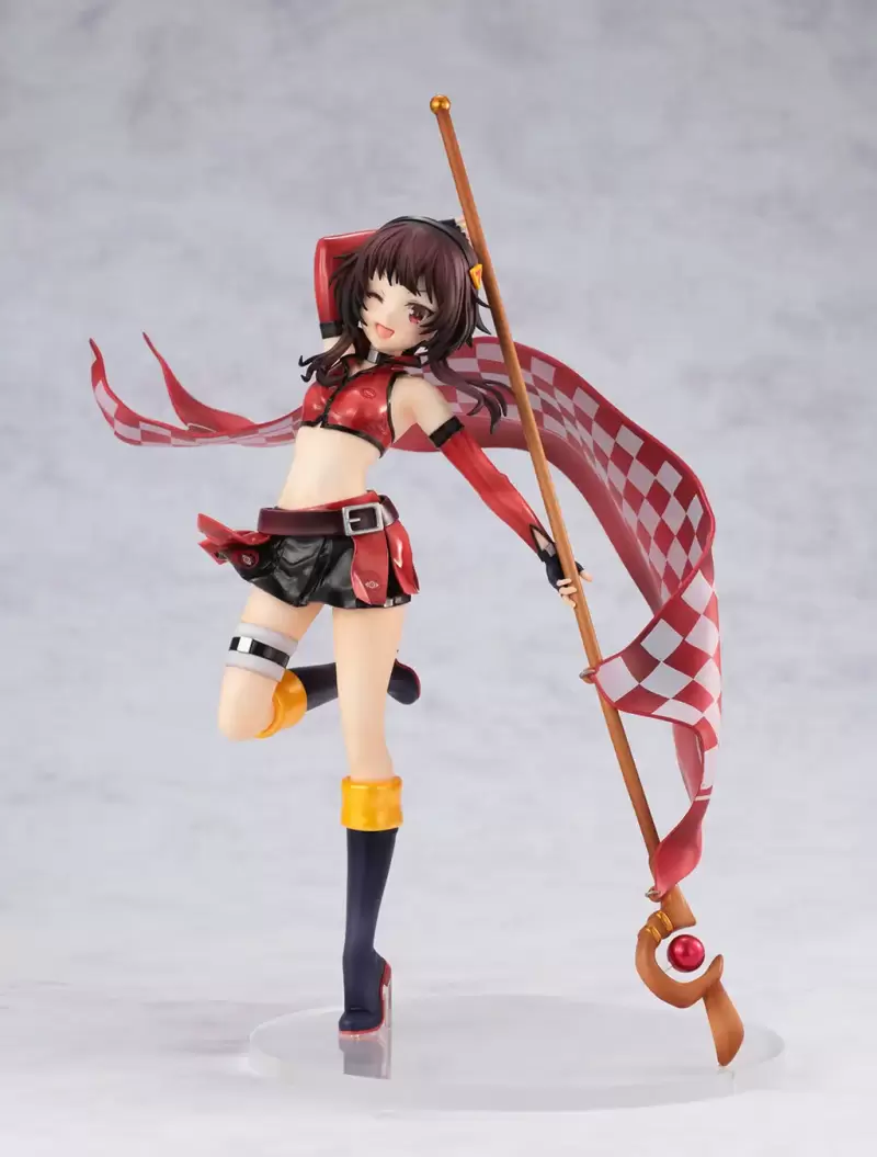 在「智障女神大人阿克婭」之後,紅魔族第一魔法師、每天都要來一發爆裂魔法〔Explosion〕的「惠惠」也化身賽車女郎來為你加油!本作高約 23 公分,在維持經典紅黑主色調性的同時,以偏性感的賽車女郎服裝重新詮釋,不過也因為惠惠的貧乳特質讓整體看起來是強烈的可愛取向,躍動的姿態、飛舞的頭髮,加上綁了巨大方格旗的魔杖,傳達出活力滿滿的青春氣息!服裝部分除了施以光澤塗裝表現出琺瑯質感外,還可以看到多個紅魔族的紋章。