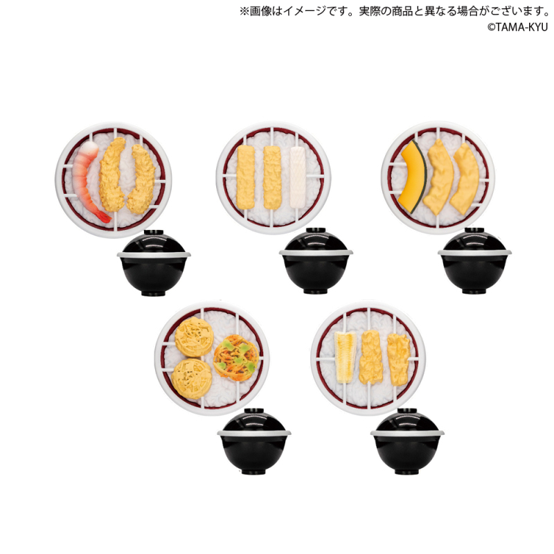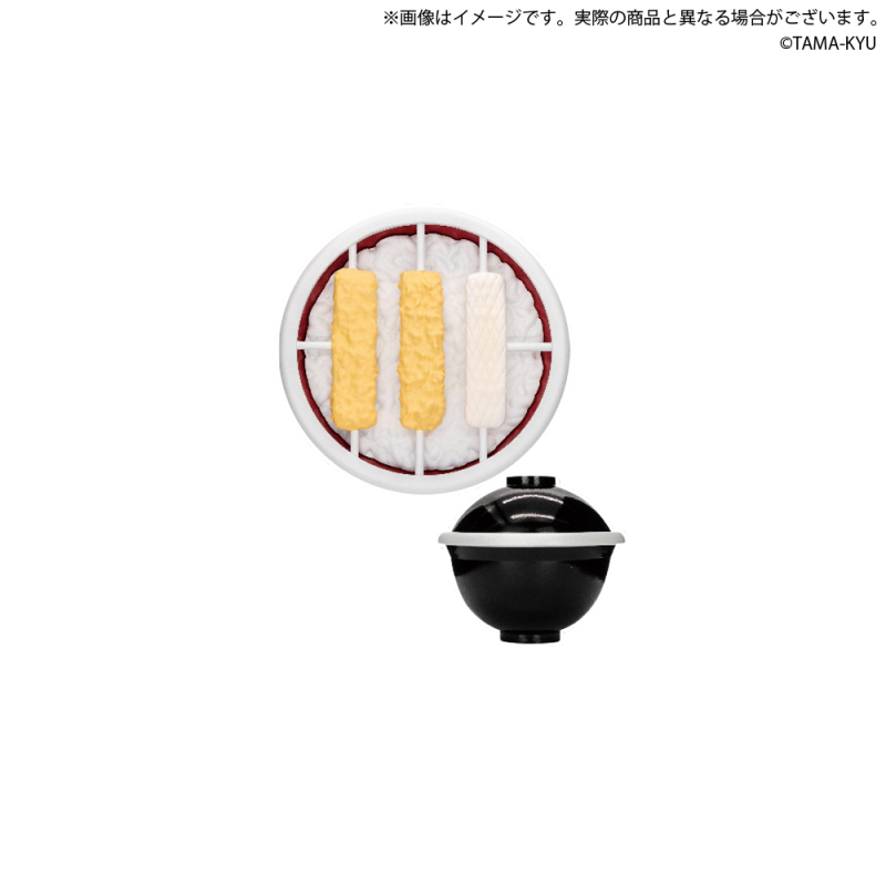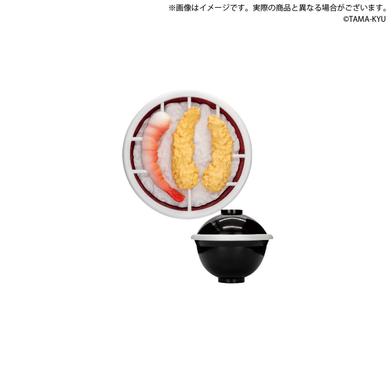 這次的「天普拉模丼」是把天丼,也就是天婦羅丼與組裝模型兩者的日文:「てんぷらどん」與「プラモデル」結合起來的產物,將一碗又一碗丼飯的構成物以組裝模型的形式拼湊起來,包含飯碗、米飯、固定著酥脆天婦羅的塑膠零件框架,並採用無殼環保轉蛋的模式推出,一共有「海老天丼」、「烏賊天丼」、「南瓜天丼」、「炸什錦天丼」,以及「穴子(星鰻)天丼」五種口味,每一碗大約是 6 公分左右;雖然 TAMA-KYU 官網有註明天婦羅沒有讓你可以剪下來的設計,但小編相信還是會看到不少厲害的改造作品,推薦給喜歡任何形式組裝模型的玩具人!