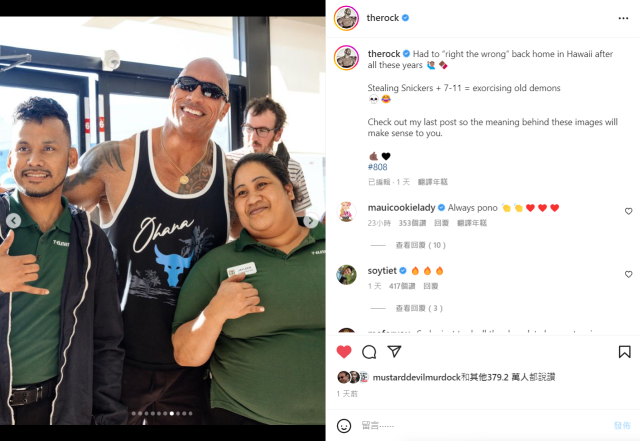 巨石強森(Dwayne Johnson)昨天在 Instagram 貼出一支他回到夏威夷老家造訪附近 7-11 的影片,並向粉絲坦露,以前他才 14 歲的時候身上沒什麼錢,所以每天去健身房之前,他都會先來這家 7-11 偷特大號的 Snickers 當作健身前必吃的食物。強森自爆,他有長達一年的時間都專門來這家 7-11 偷 Snickers,而且有位店員一直都故意裝作沒看見,從來沒有抓他的犯行。