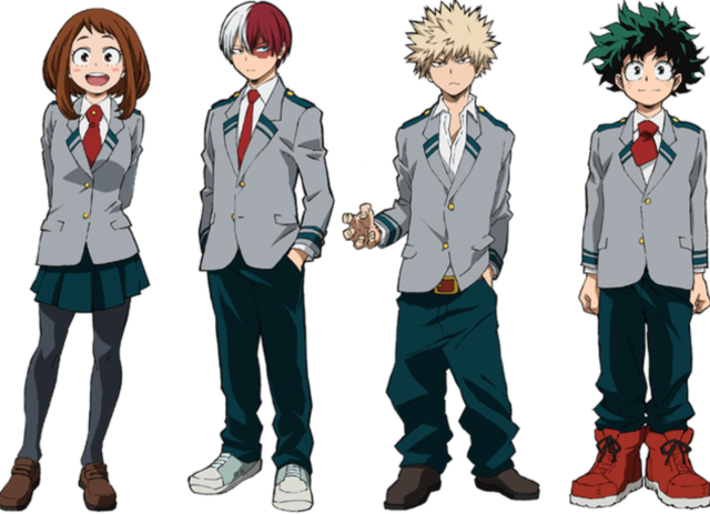 不論是男性與女性都一致票選的第一名,就是我英的學校制服啦 ! 以灰色搭配白色以及綠色的細節設計。女性網友們表示非常喜愛女生也能穿上帥氣的西裝外套,搭配短裙真的很時髦又好看;而男性則對於服裝搭配的自由度非常推崇,可以看到綠谷、爆豪與焦轟三人的服裝細節上都略有不同,自由穿搭可說是男性最重視的。