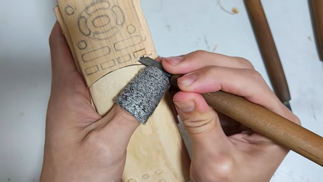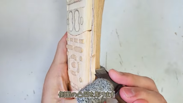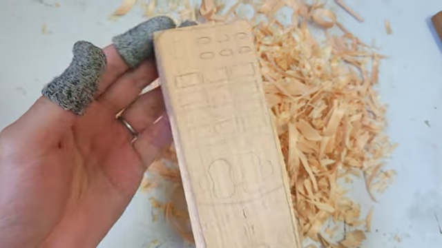 木彫りのぽっぽ非常堅持使用手工雕刻,在原木木板上先行畫出遙控器的按鍵與雛形後,開始一步步像是畫筆一般的用雕刻刀開始上工。