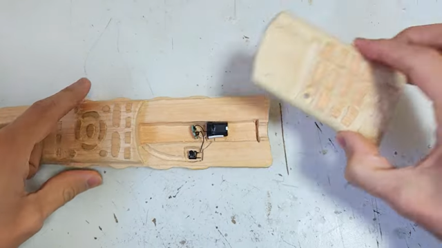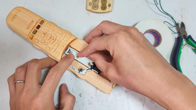 當然,純粹只是木雕遙控器好像有點無趣,他也在裏頭塞入了按鈕式的紅外線燈,透過木雕遙控器上的按鈕就可以使用 !