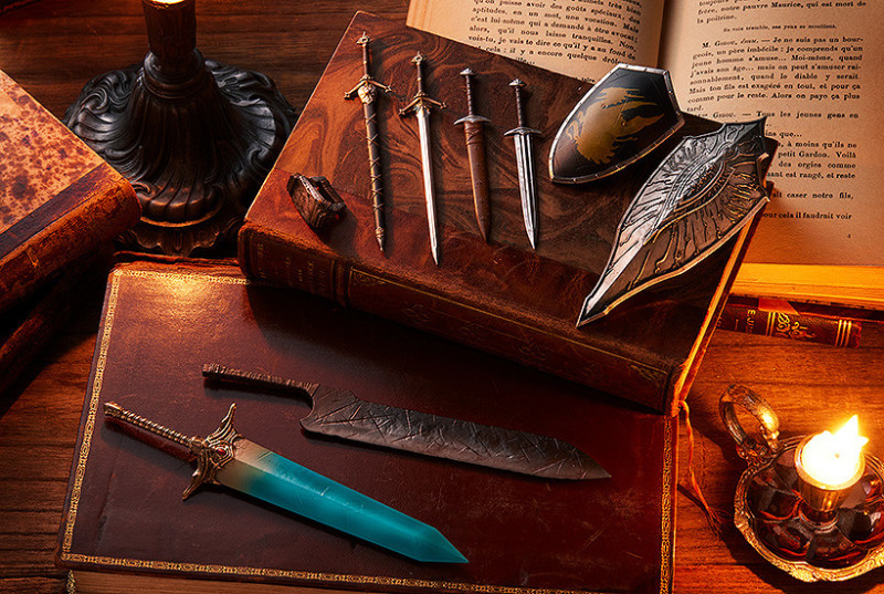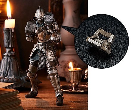 配件部分附有豪華的人氣武裝陣容,包含「闊劍」、「鳶盾」、「北騎士劍」、「切肉刀」、「暗銀盾」、「鐵指虎」以及魂系列歷代都登場的代表性武器「月光大劍」等,每把武器也同樣施以極具質感的金屬色塗裝、風化塗裝,月光大劍則使用透明材質表現出劍身發光的質感。另附有能背起盾牌的固定零件,雙手能夠自由搭配你喜愛的武器!