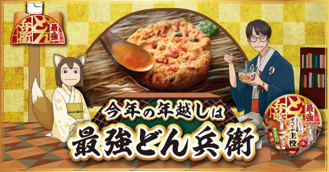 這次的合作是一樣主打日清新商品「最強咚兵衛」的天婦羅烏龍麵,可以看到充滿大童澄瞳風格的吃麵男子與小狐狸在屋內互動。