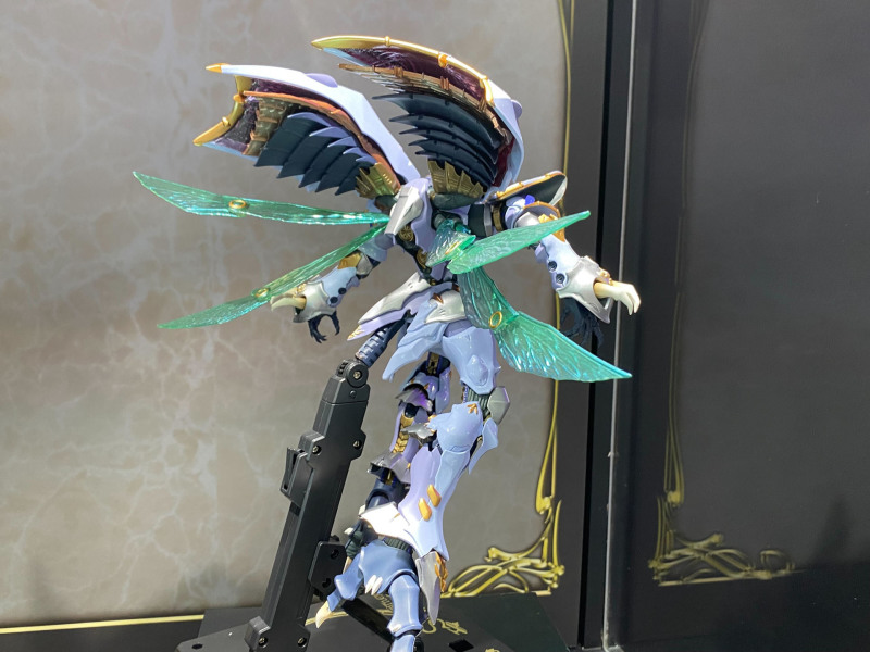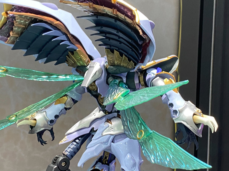 「METAL BUILD DRAGON SCALE 薩拜因」基於機械設計師出渕裕的畫稿延伸設計,除了融入現代風格的高挑身形、裝甲分割配置外,也刻畫出彷彿甲蟲極具生物感的裝甲曲線,並施以具備珍珠光澤的亮麗塗裝,以多種金屬色表現機械構造與華麗的金色雕紋,特別在雙翼內側製作出高密度的葉片結構提升機械感,多處關節也採用合金零件製作。