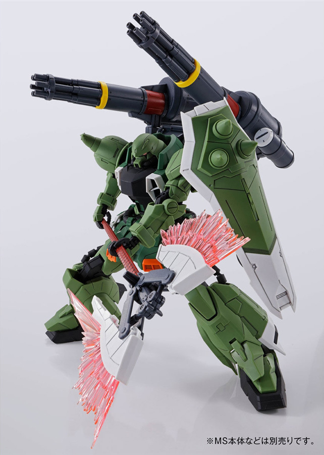 「MG 1/100 砲擊型/斬擊型/瞬發型輔助裝備套組」將過去隨著薩克戰士系列機推出的三款背包零件同梱販售,整體造型、成形色沒有變化,並附上印有機身標誌的水貼紙可使用。此商品除了能夠對應已發售的薩克戰士、薩克幽靈系列機外,也能裝備在套件中包含轉接零件的「MG 1/100 星蝕鋼彈」、「MG 1/100 異端鋼彈非規格機D」等商品上。