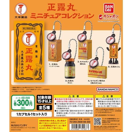 GASHAPON「正露丸 迷你收藏」轉蛋,經大幸藥品授權,將人氣商品以約 5 公分的尺寸微縮轉蛋化!收錄有正露丸 包裝ver.、正露丸 瓶裝ver.、正露丸糖衣A、正露丸糖衣A 橫向ver. 四種藥品,以及吉祥物正露丸君!每款皆附有特徵的喇叭標誌小吊牌,精緻刻劃的包裝細節也相當吸睛!