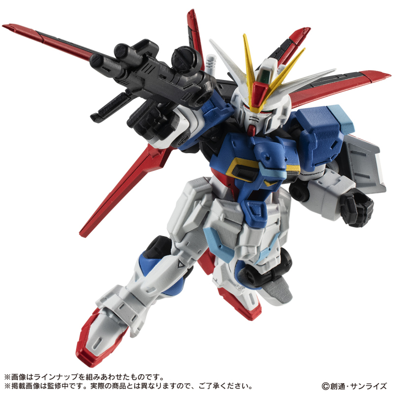 其中脈衝鋼彈具備魅影系統的換裝機構,能裝上威力型背包再現威力型脈衝鋼彈。最後在「MS武裝組」中則有透明成形色的薩克熱能斧、薩克火箭炮,以及脈衝鋼彈的核心飛梭與一把「石中劍」雷射對艦刀。可搭配各機體進行換裝。