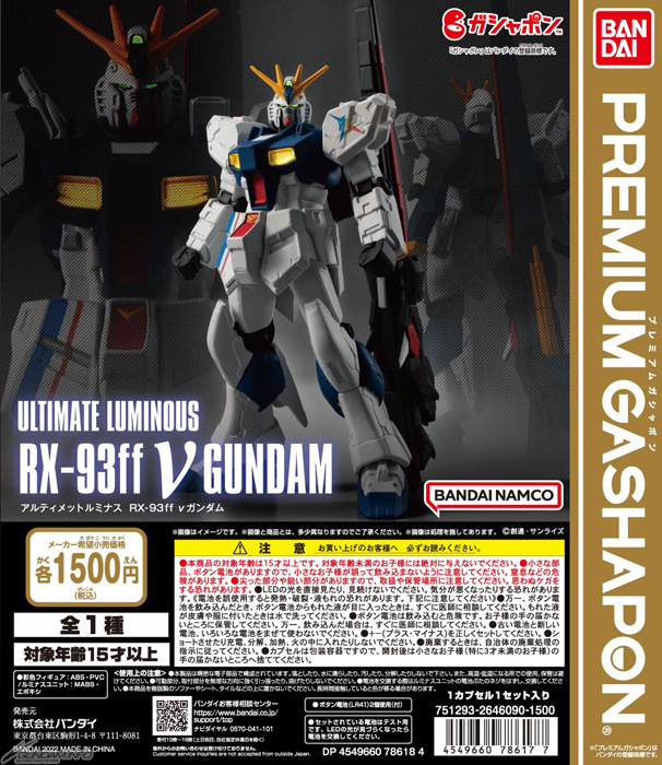由日本萬代玩具公司轉蛋品牌 GASHAPON 發行,主打究極造型x究極光輝的人氣轉蛋商品『ULTIMATE LUMINOUS』系列推出以福岡實物大 ν 鋼彈立像為主題的最新商品「ULTIMATE LUMINOUS RX-93ff ν鋼彈」,現已於 namco LaLaport 福岡店限定販售中!