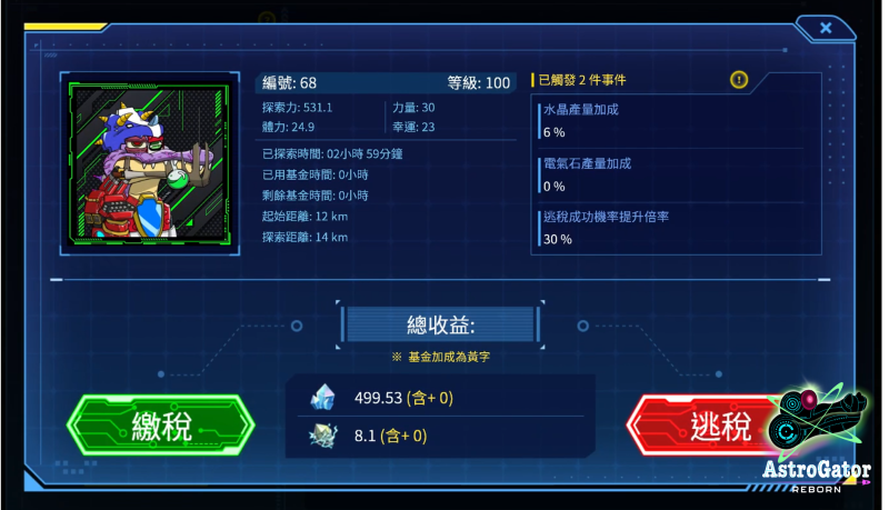 繳稅是國民應盡的義務,在《太空鱷魚:重生》區塊鏈遊戲中鱷魚們繳稅和收稅可是遊戲中經濟循環裡非常關鍵的要點。在遊戲中分為「統治鱷」和「探索鱷」,金色品質的統治鱷可以向其餘灰、白、綠、藍、紫色品質的「探索鱷」收稅。「探索鱷」在回城之後收取資源時,可以選擇乖乖的穩妥繳稅或是僥倖心態的逃稅。但是,逃稅可是會有逃稅的風險要承擔,假使逃稅失敗,全部的稅金都會被「統治鱷」給奪走!玩家可在遊戲中探索時,會透過隨機事件拿到不同的獎勵,若拿到了逃稅機率加成的獎勵,建議再選擇逃稅,逃稅成功機率才會比較高。「探索鱷」若選擇逃稅時,將啟動逃稅機率轉盤,萬一轉到香蕉皮,就註定逃稅失敗了,稅金全數歸「統治鱷」所有;假如運氣好轉到瞞天過海,即可獲得50倍的收益喔!而身為「統治鱷」的玩家在收稅時,也可以選擇一般收稅或付出一點成本試手氣的抓稅,若是抓稅失敗尚有部分收益可以保留,倘若抓稅大成功,抓到肥滋滋的鱷魚,同樣有機會收成50倍收益。