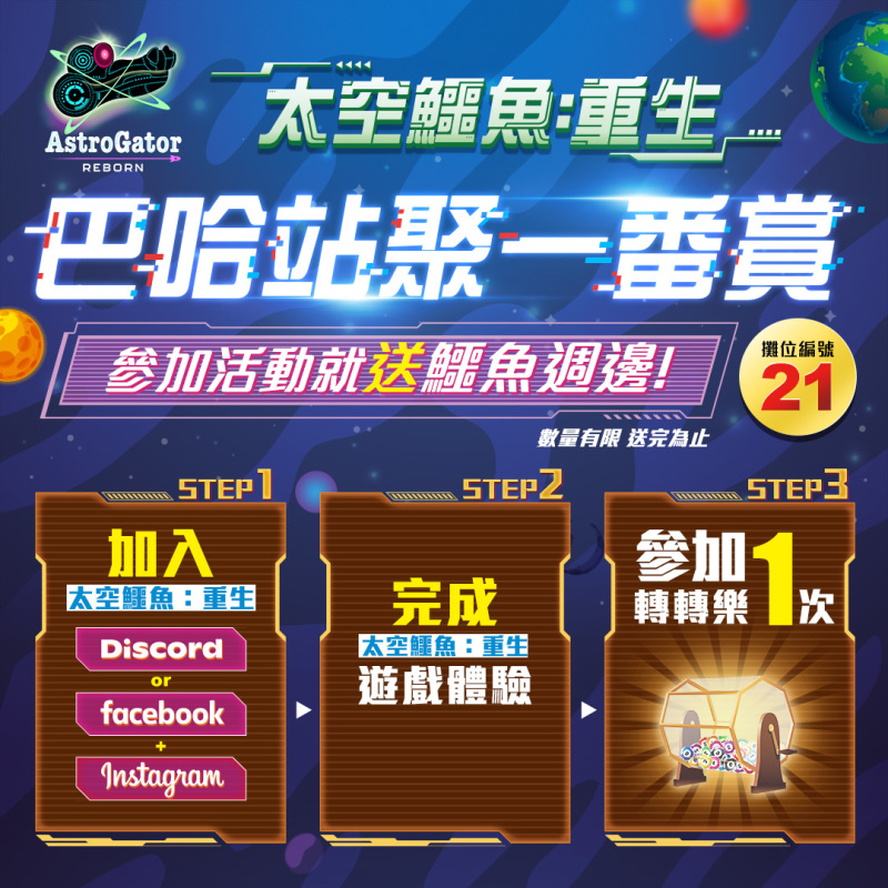 12/10巴哈姆特26週年站聚活動,《太空鱷魚:重生》在21號攤位準備了多項周邊商品:超質感大滑鼠墊、帥氣魚型口罩、造型筆電貼紙、多功能鍵盤刷…等,等你來拿喔!現在就打開你的電子錢包和網頁瀏覽器,準備好你的《太空鱷魚:重生》NFT,一起進入到《太空鱷魚:重生》GameFi的世界吧!更多遊戲的詳情和各種福利活動請持續關注《太空鱷魚:重生》官方網站和官方社群平台。