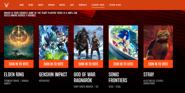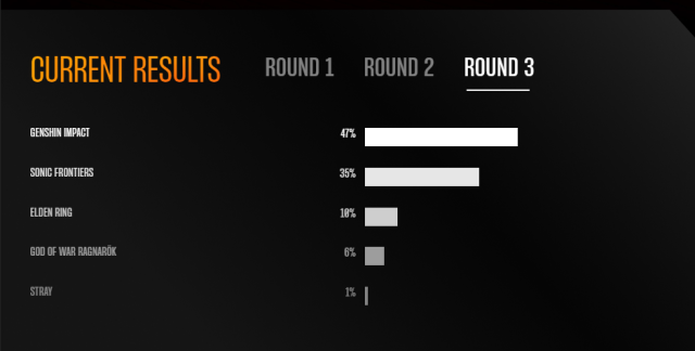 截至目前撰寫文章的時間,《原神》是以47%的投票率暫時拿下第一,而《音速小子 未知邊境》則是以35%的得票率暫居第二,其他除了第三順位的《艾爾登法環》之外,PlayStation 5、PlayStation 4獨佔發行的《戰神:諸神黃昏》,以及貓咪冒險遊戲《Stray》則是分別擠進第四名和第五名的位置。