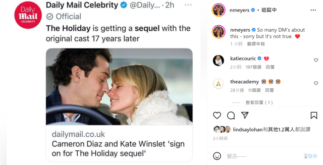 更新:消息傳出後,導演南希梅爾斯則在她個人的 Instagram 發文澄清此事絕非屬實,《戀愛沒有假期 2》並沒有真的要開拍:「我收到好多私訊都在問這件事。很抱歉,但這不是真的。」正在宣傳《阿凡達:水之道》(Avatar:The Way of Water )的凱特溫絲蕾也向《People》雜誌解釋:「我跟你保證,沒有一個經紀人、代理人或任何第一集的相關人員跟我聊過這件事,我真的發誓,這整件事並沒有發生。」