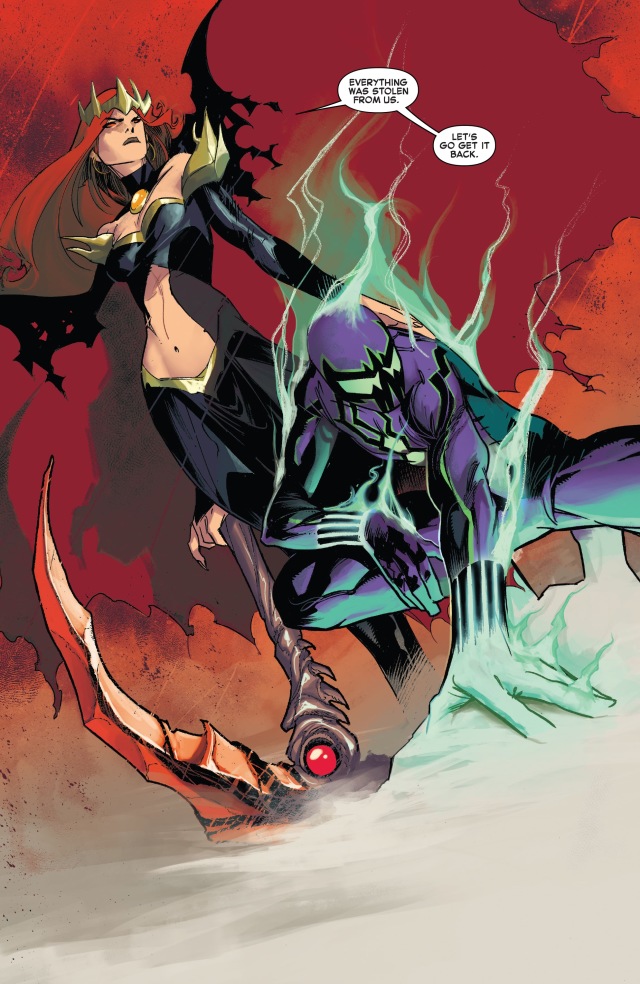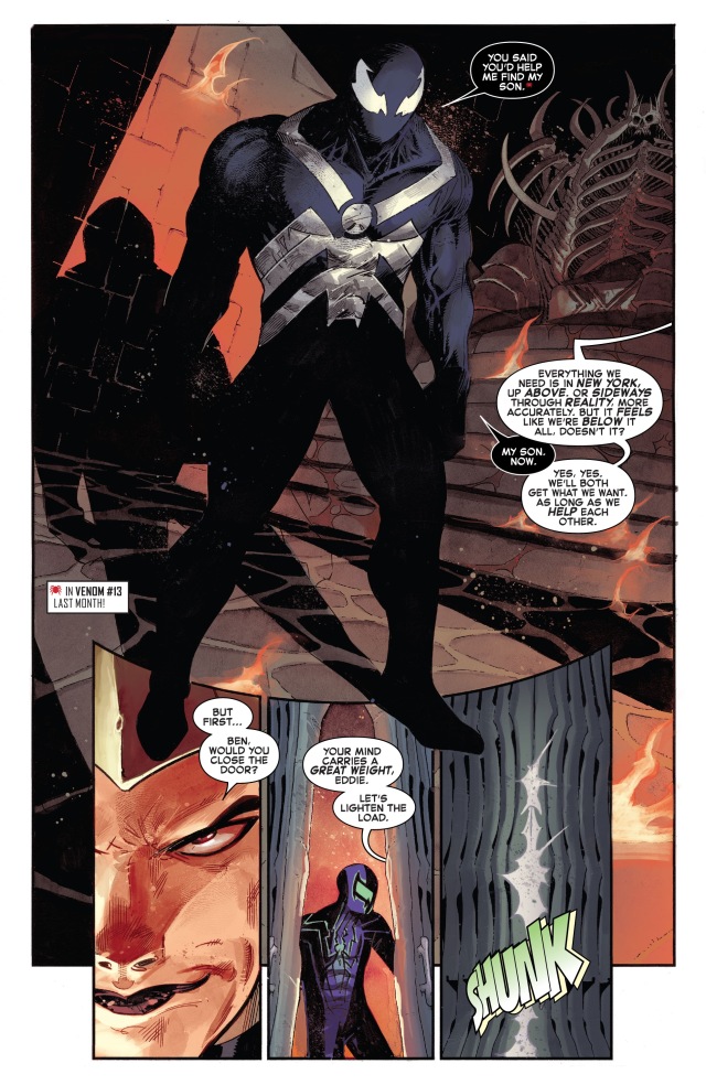 現任的「黑衣之王(King in Black)」,艾迪‧布洛克(Eddie Brock)!最近在個人連載中陷入了時間迴圈以及與未來版本的自己戰鬥的他,為了擺脫現狀而意外來到了這個地獄維度,並與哥布林女王交了朋友。