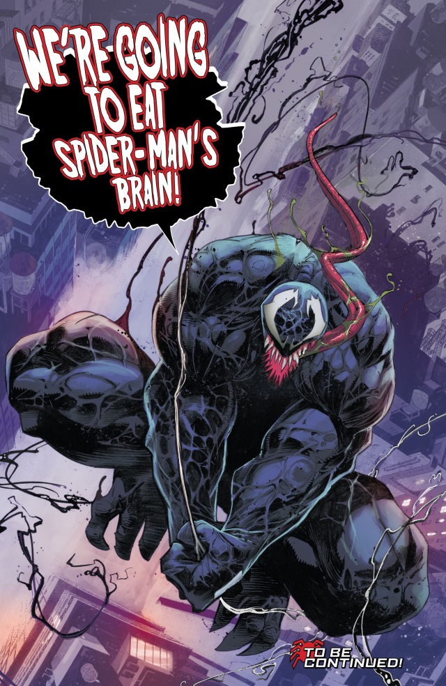 看來她不小心把艾迪變回過往的那個猛毒(Venom)模樣啦!而那個經典的致命守護者猛毒最想做的事情之一,莫過於吃掉蜘蛛人的腦子!