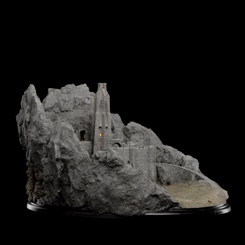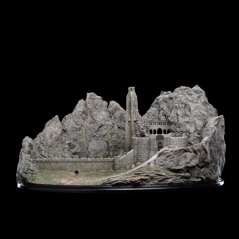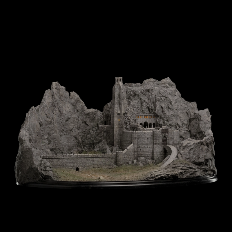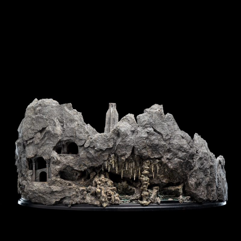 本作在 55 公分長、27 公分高的規格中將「聖盔谷」與周遭的山壁壯觀雕像化,整體是依照電影拍攝時製作的模型、照片與資料來製作,從城牆、城門、階梯、瞭望塔、渠道、大廳,到背面的閃耀洞穴(Glittering Caves)都施以精湛的手工雕刻,力求在呈現出精緻細節的同時,也將這座堡壘的數百年歷史痕跡表現出來,就連岩石的不同質地都是造型師 Leonard Ellis 仔細考慮的一點,除此之外,堡壘內部更可以利用如同火炬一般的發光功能增添真實感,真的是一款超猛的傑作!