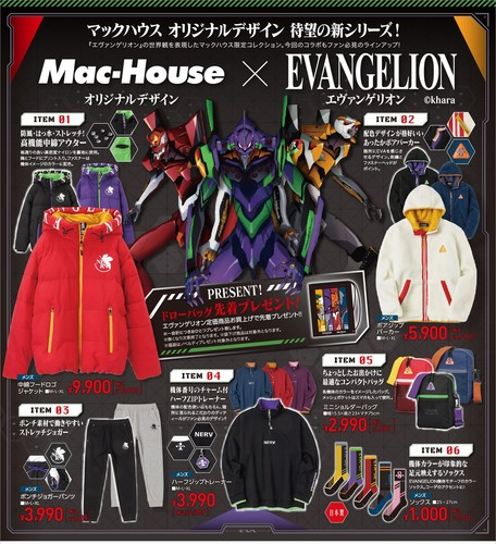 雖然劇場版最終章的作品《新世紀福音戰士》已經完結,但合作聯名可不停歇。近日宣布將與先前合作過的日本服飾品牌 Mac-House ( マックハウス ) 推出一系列服飾商品,主要以秋冬服飾為主。目前已於官方網站上開賣。
