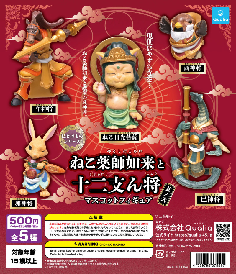 日本轉蛋玩具廠牌 Qualia 攜手日本造型師「三条獅子(@sanjyousisi)」在推出「貓藥師佛與十二神將-其之壹」之後,又將推出最新作「」貓藥師佛與十二神將-其之貳」轉蛋,一共有五種款式,每轉參考售價為 500 日圓,預計將於 2022 年 12 月開轉。