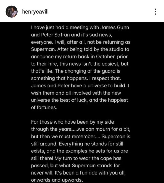 「這是個壞消息,從此以後,我不會繼續演出超人。雖然今年十月才重新回歸,這不是一件容易的事,但人生就是這樣,換崗是常有的事。我尊重他們。岡恩有他們的宇宙要建立,我祝福他們以及任何與全新宇宙有關的人物事事順心。」