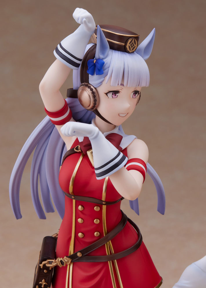 「黃金船 第一名的勝利姿勢 1/7比例模型」基於遊戲中黃金船獲得第一名時作出的俏皮勝利姿勢立體化,藉由細膩的造型與塗裝表現出舉起雙手、勾起左腳的可愛姿勢,頭髮與尾巴則具備柔順的毛束感與漂亮的銀灰色澤。鮮豔的紅色勝負服則製作出鈕釦、銅環、皮帶腰包的精緻細節造型,並施以大量金色塗裝再現豪華的色彩。原型底座的側面施以和第一名呼應的金色塗裝,頂部則是以賽場為意象使用綠色絨布仿造整齊的草皮。