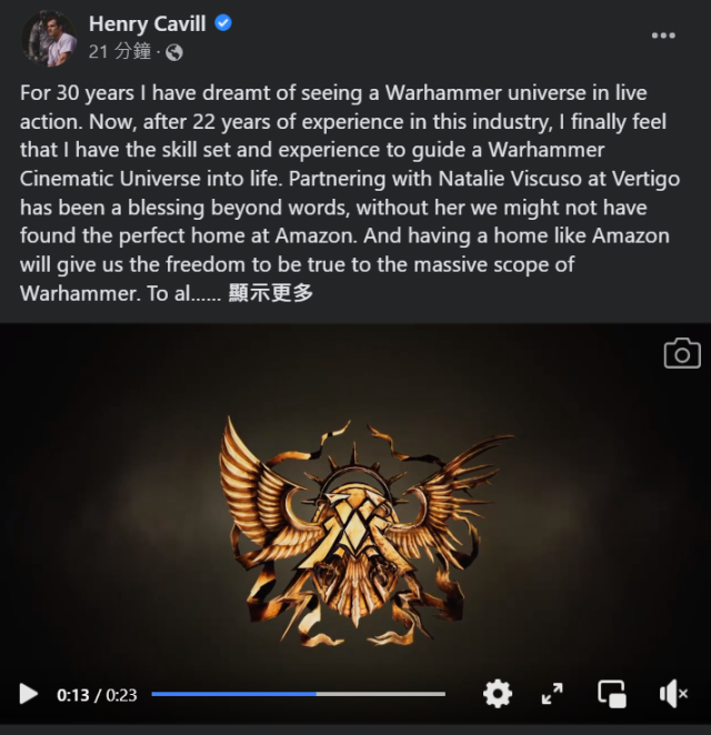 更新:就在消息曝光後將近一天,卡維爾也終於在社群媒體發佈宣傳影片親自證實這項消息,並加碼補充,他不只要拍《戰鎚》影集,更要打造橫跨電影、影集的《戰鎚》宇宙。卡維爾在貼文中寫道:「30 年來,我一直夢想看到真人化的《戰鎚》世界,如今,在這行業從事了 22 年,我終於覺得自己具備了能將《戰鎚》電影宇宙實現的技能和經驗。與 Vertigo 娛樂的娜塔莉薇絲卡索(Vertigo 電視副總,卡維爾的女友)合作是一份無法言喻的恩賜,沒有她,我們可能無法找到像 Amazon 如此完美的家。」
