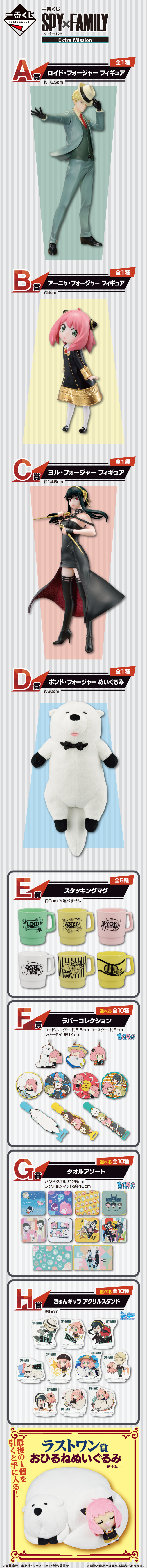 日本 BANDAI SPIRITS 公司旗下抽抽都有獎的超人氣「一番賞(一番くじ)」,繼「 SPY×FAMILY -Mission Start!-」後,將再度以《SPY×FAMILY間諜家家酒》為主題,發表最新的「一番賞 SPY×FAMILY -Extra Mission-」,每抽參考售價為 780 日圓,預計於 2023 年 1 月 21 日在日本開抽!