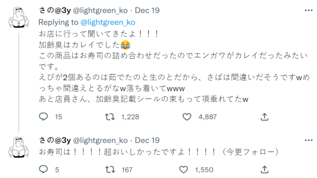 這麼詭異的形況,決定回到店裡再問清楚,結果店員解釋其實那是鰈魚 (カレイ) 的鰭邊肉,是當初標示成份時因為假名誤植了...(加齢臭,かれいしゅう),連店員都很驚訝怎麼會標示成這樣...www。雖說沒有講是哪一家壽司店,不過看來這位網友認為超級美味的 XD。