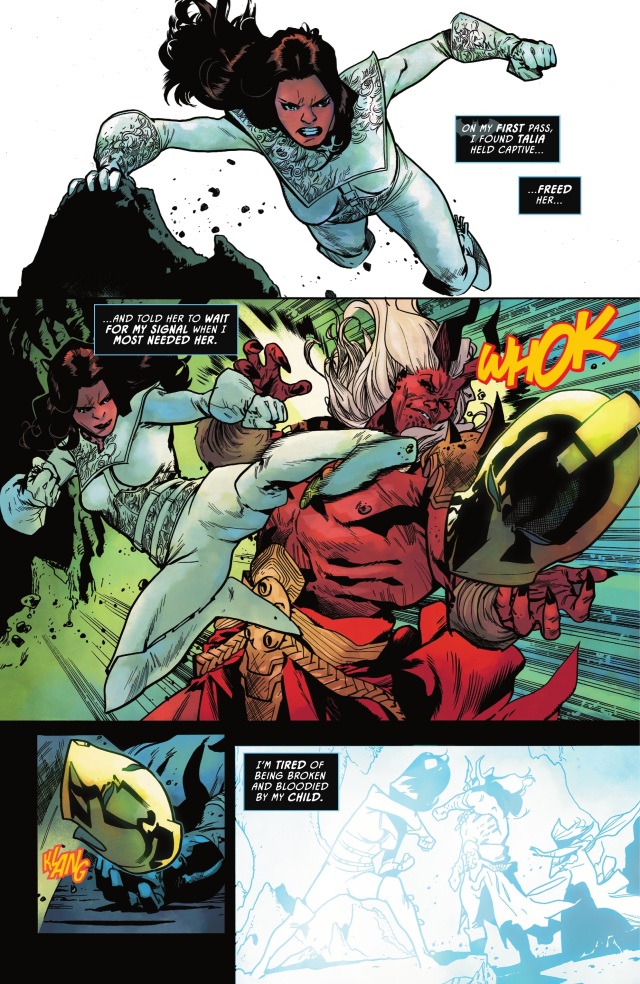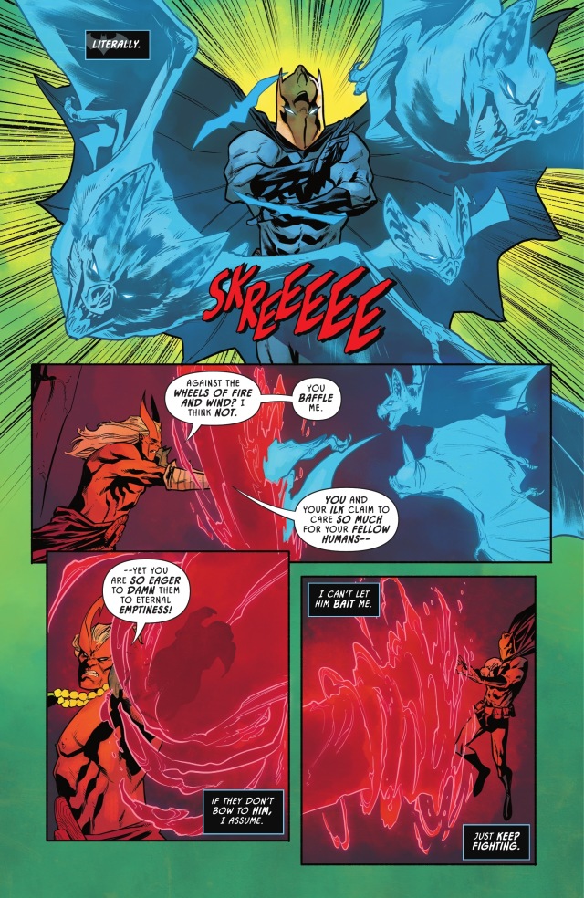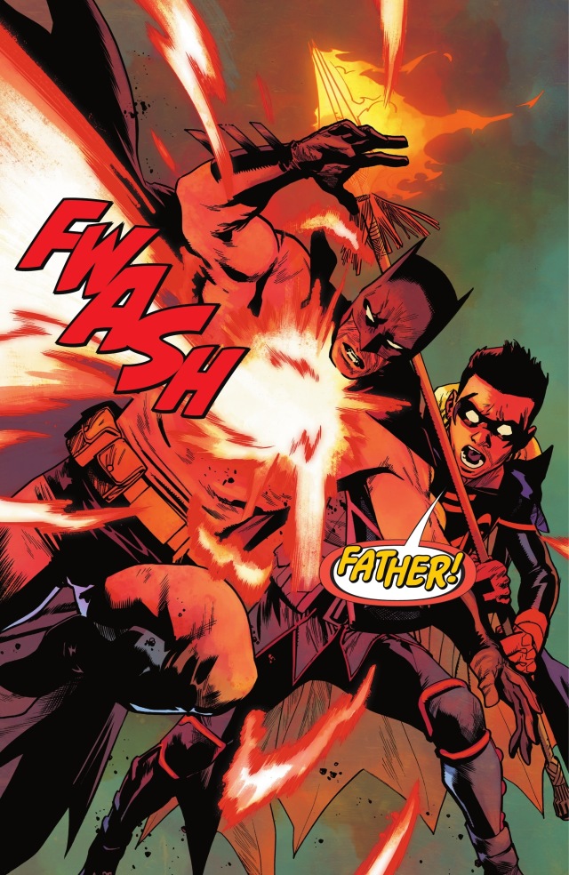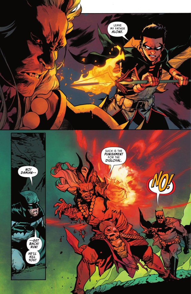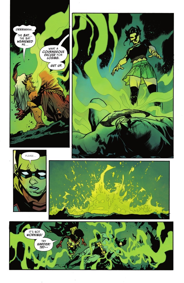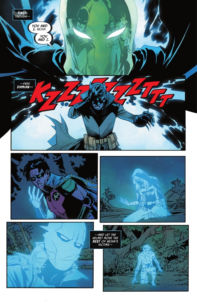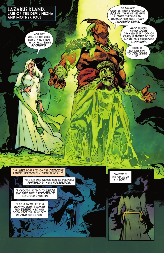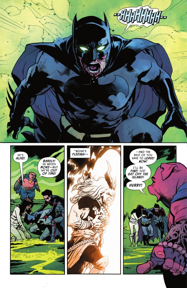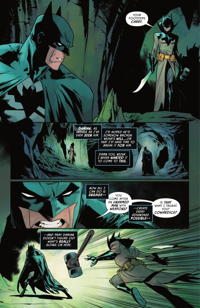蝙蝠俠讓達米安去協助他母親對付他曾祖母,自己則以這股新的魔法力量來與哪吒正面對戰。