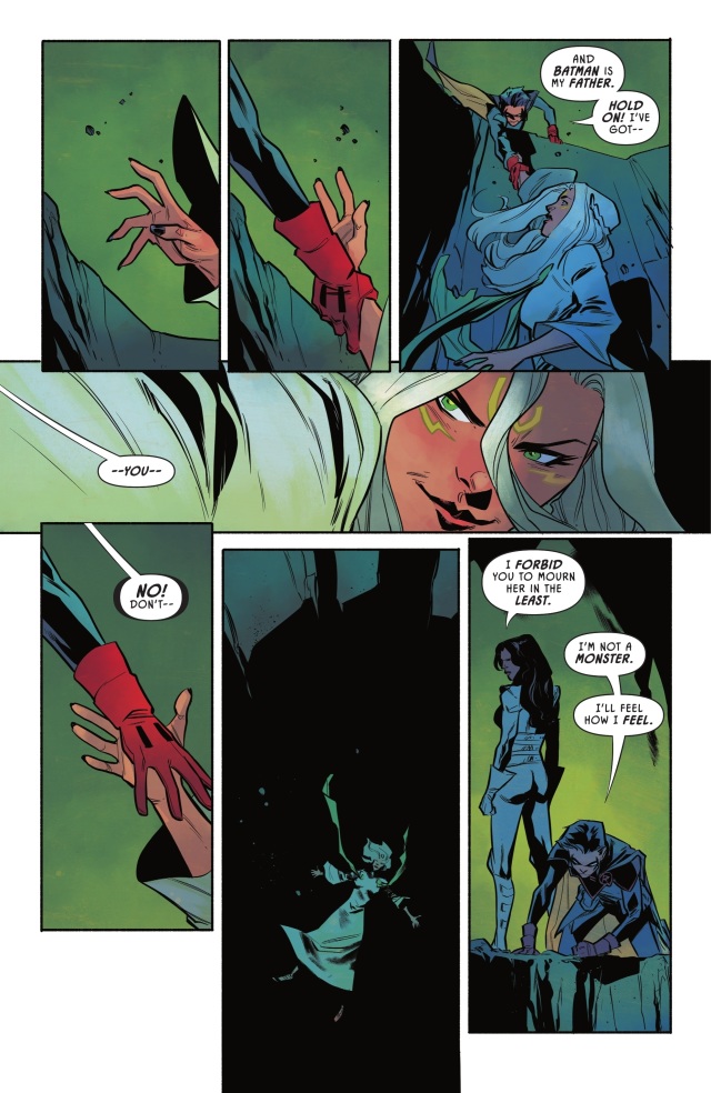 不再受道德束縛的達米安在與已經受傷的父親的戰鬥中迅速取得上風,讓哪吒得以前去拿起已經被黑愛麗絲(Black Alice)灌注了許多魔法寶物的力量的命運博士(Dr. Fate)的頭盔。