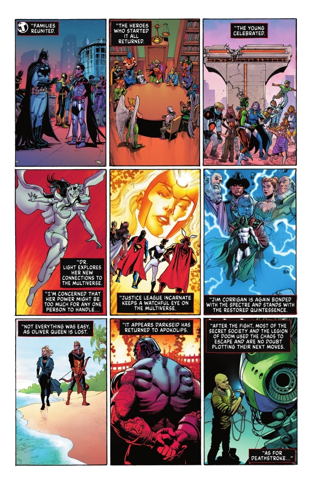 所以,在沒有什麼事情真的被改變的情況下,DC漫畫最新的大事件到此完結。雖然說多元宇宙的規模再度變得比以往更大、綠箭俠也行跡不明、正義聯盟更是表達要解散;但是反派們又再次回到了自己的位置上,而總會有新的英雄挺身擔起捍衛正義的工作,保護世界。