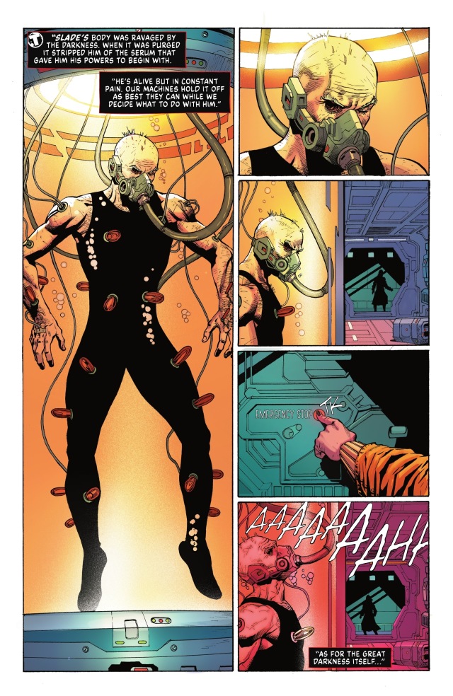 前一回,英雄們已經成功將這次危機的始作俑者「賤民」(Pariah)給成功淨化並驅逐,但是他體內的黑暗卻轉移到了手下「喪鐘」(Deathstroke)的體內,繼續他的意志和控制著黑暗大軍,更是抓住了夜翼(Nightwing)和自己的女兒劫掠者(Ravager)。