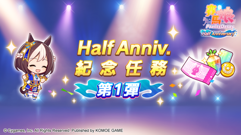 因應半週年的來到,「Half Anniversary紀念任務第1彈」也特別開跑,完成期間限定任務可獲得500個寶石及1張培育賽馬娘轉蛋券等報酬!