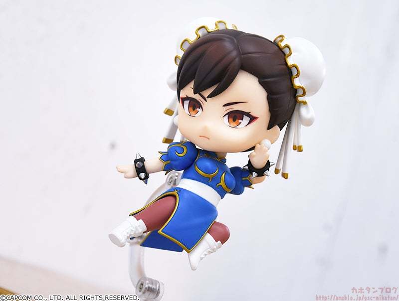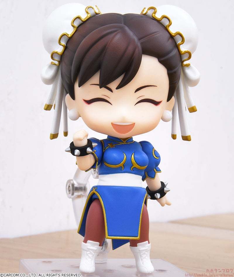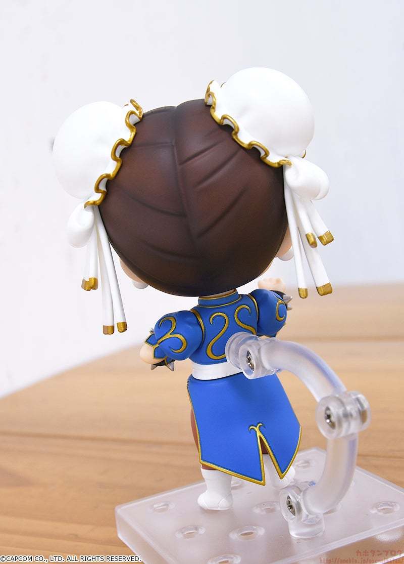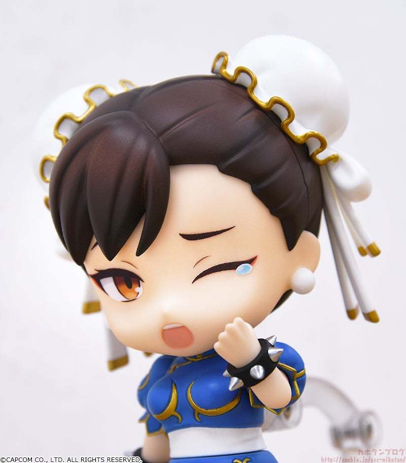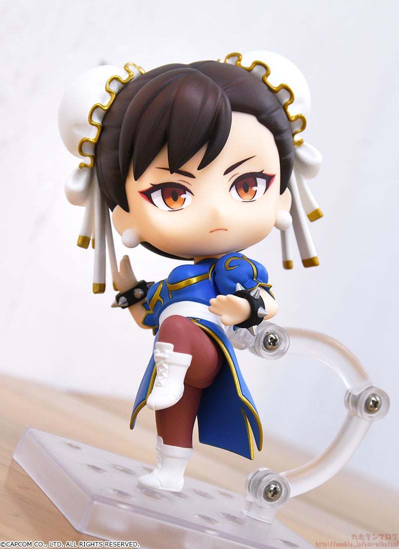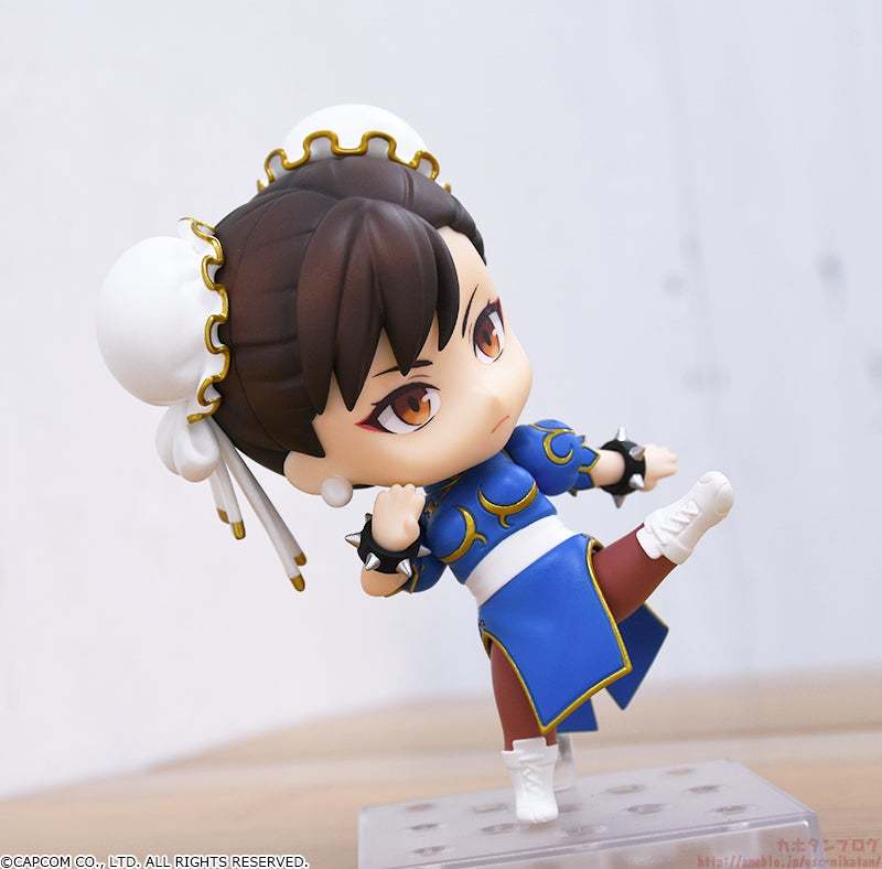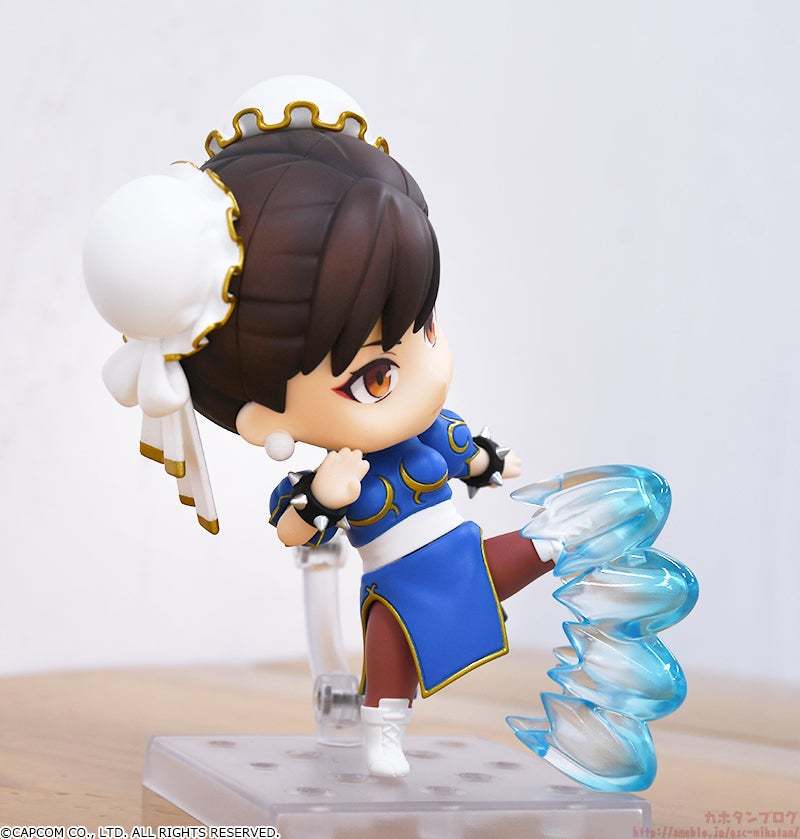 「黏土人 春麗」可動人偶,尺寸約高 10 公分,以 Q 版的黏土人風格還原春麗最經典的造型,頭上特色的雙包包頭以及充滿中國風的藍色開叉旗袍、鉚釘手環等~附有戰鬥時凜然的「普通臉」、開心的「勝利臉」與「打哈欠臉」三款替換表情,配件則是有透明的「百裂腳特效」、「氣功拳特效」,以及「專用下半身零件」,可以重現各種遊戲中的戰鬥姿態!