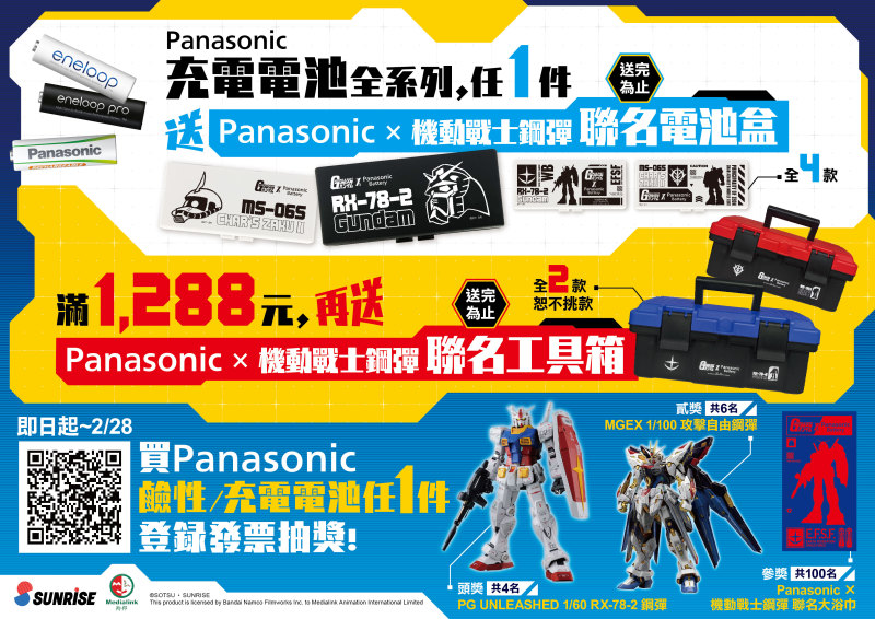 再來是充電電池的活動!即日起~2023 年 2 月 28 日,指定通路買 Panasonic 充電電池全系列任 1 件就送機動戰士鋼彈聯名電池盒(共 4 款隨機贈送);滿 1,288 元再送機動戰士鋼彈聯名工具箱(共 2 款隨機贈送),送完為止!