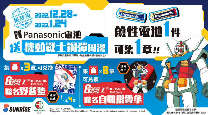再來是本次 Panasonic Battery ×《機動戰士鋼彈》聯名活動的最後一個,不過這個是全家會員限定!從 2022 年 12 月 28 日~2023 年 2 月 7 日,全家便利商店會員至全家門市購買 Panasonic 鹼性電池即可參加「集章趣任務活動」,買 1 件可集 1 章,集 3 章就可兌換機動戰士鋼彈聯名野餐墊(共 4 款隨機贈送);集 8 章可兌換機動戰士鋼彈聯名自動摺疊傘,送完為止!