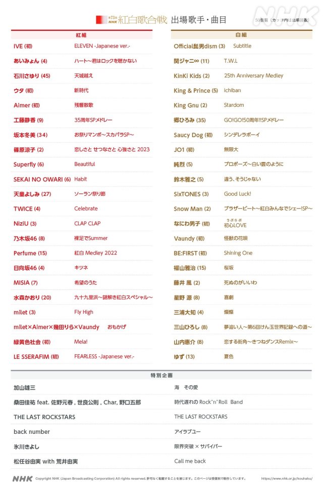 NHK第73回紅白歌唱大賽將於2022年12月31日晚上7點20分開始,一直到11點45分結束,至於歌曲名單也有待之後官方的進一步公告。
