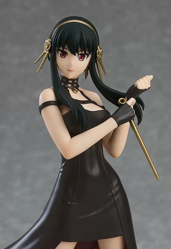 「POP UP PARADE 約兒‧佛傑」PVC模型,尺寸全高約 17 公分,以約兒擔任殺手時身穿的黑色禮服為造型,性感露出胸前與腿部的肌膚,頭上的髮飾與武器「Stiletto」施以質感金屬色,裙擺內部的薔薇花紋也仔細再現!服裝刻意營造出輕薄貼身的質感,包覆纖細的身材,在肚臍、臀部等處有合身的皺褶細節,讓整體更加性感迷人~